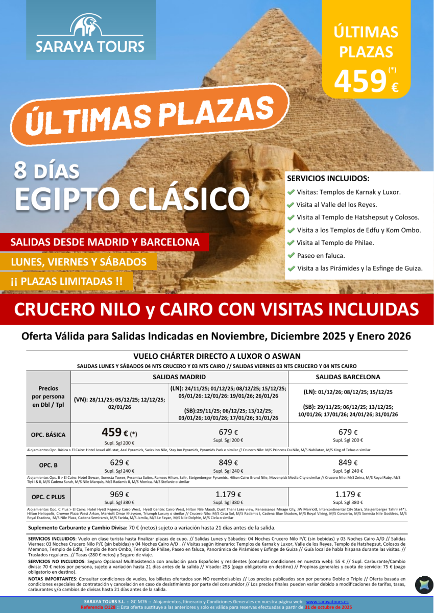 Últimas Plazas! Egipto Clásico 8d. dsd 459€ Vuelo directo, Crucero Nilo y Cairo con Visitas Plazas limitadas